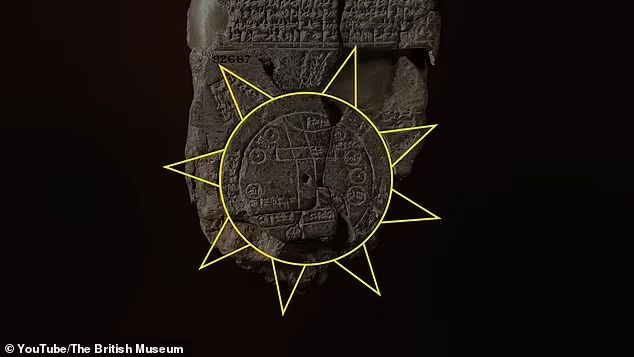 Tablet Babilonia memiliki peta melingkar dengan potongan-potongan teks yang ditulis dalam aksara paku – sistem penulisan kuno yang menggunakan simbol berbentuk baji – yang menggambarkan awal penciptaan dunia.