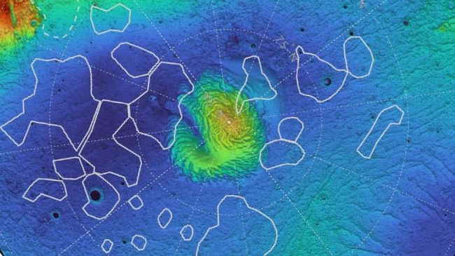 Peta baru itu juga mengonfirmasi keberadaan gumpalan besar selebar 1.100 mil (1.750 kilometer) di bawah Olympus Mons, gunung berapi yang tidak aktif di dekat ekuator Mars yang, dengan ketinggian lebih dari 16 mil (25 km) di atas permukaan planet, merupakan gunung tertinggi di Tata Surya .