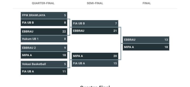 Sport) selanjutnya tim MIPA A berhasil melewati tim EBBRAU 2 dan FIA UB A. Tim MIPA A bertemu Tim EBBRAU 1 yang pernah satu grup. Dan Tim MIPA A berhasil menjadi juara di kompetisi yang digelar di GOR Pertamina Universitas Brawijaya.