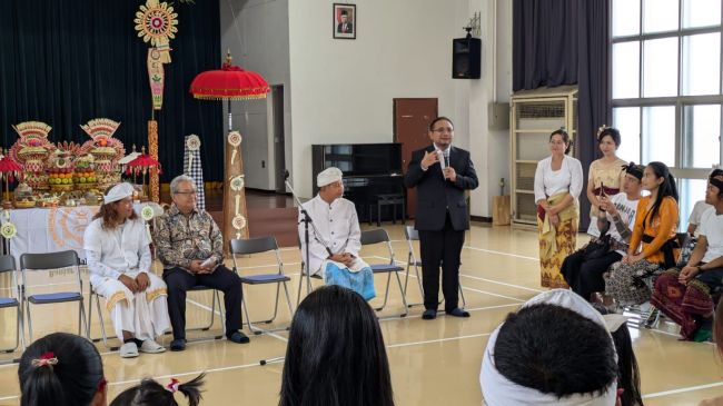 TOKYO, Sketsakini.com- Menteri Agama Yaqut Cholil Qoumas dalam kunjungan kerja ke Negeri Sakura menyapa umat Hindu di Jepang. Momen ini berlangsung saat umat Hindu menggelar Perayaan Hari Raya Galungan dan Kuningan di Balai Indonesia, Sekolah Republik Indonesia Tokyo.