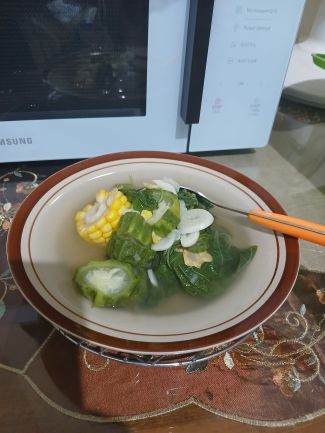 Rebus satu liter air, masukkan irisan bawang merah, bawang putih, kaldu jamur dan jagung. Setelah jagung matang masukkan oyong. Kemudian masukkan bayam hingga matang. Angkat dan hidangkan.