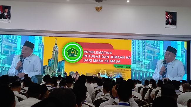 TANGERANG, Sketsakini.com| Khoirizi H Dasir, Dosen Universitas Islam Negeri Bandung, memberikan materi pembekalan petugas haji di Asrama Haji Cipondoh, Tangerang, Banten, 4/5/25. Dia menyampaikan materi Problemamatika Petugas dan Jemaah Haji dari Masa ke Masa di hadapan sekitar 1000 peserta.