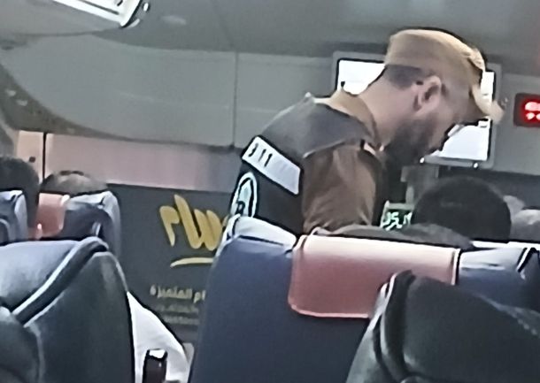 Seorang petugas masuk bis dan mengecek satu per satu nomor Visa milik petugas haji Indonesia. Petugas itu mengagungkan jempol jika visa yang diperiksa valid. Pemeriksaan dilakukan satu per satu tanpa kecuali.